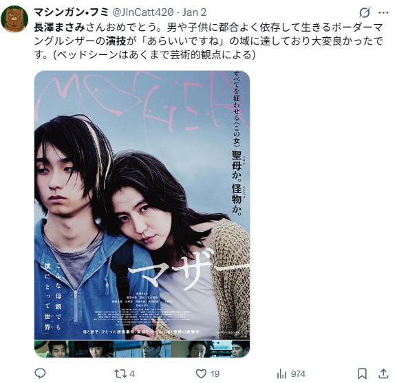 観る側に不快感すら与える難役を引き受け、 感情を煽らず淡々と演じ切った点が高く評価されました。