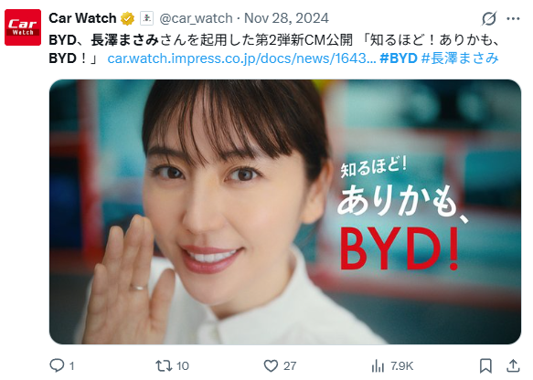中国EVメーカーと日本のトップ女優という組み合わせは話題性が高く、ブランド戦略としても注目を集めています。