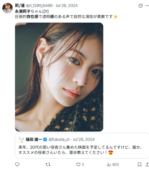 本記事では「永瀬莉子 演技 評価」という検索意図に応える形で、 代表作・演技スタイル・評価される理由についてまとめました。