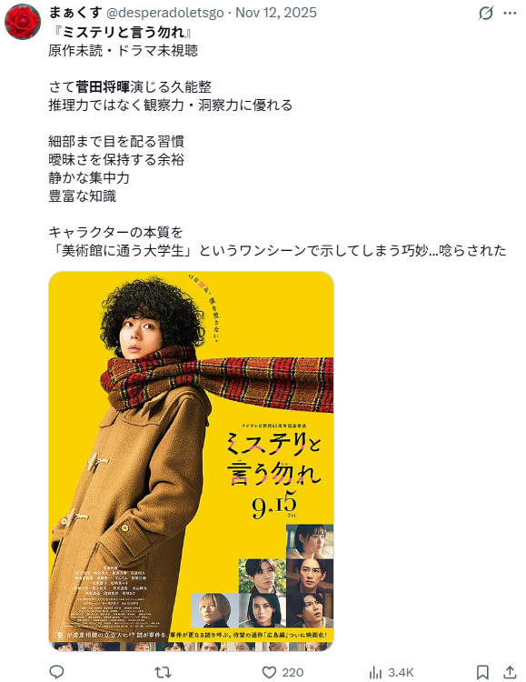 映画ファンや演劇経験者からは、 菅田将暉は比較的高く評価される傾向があります。